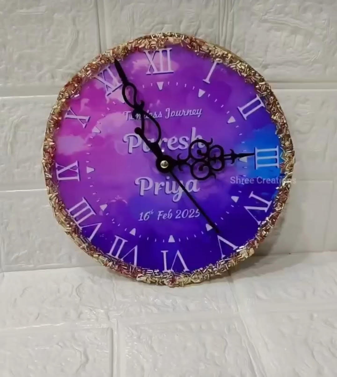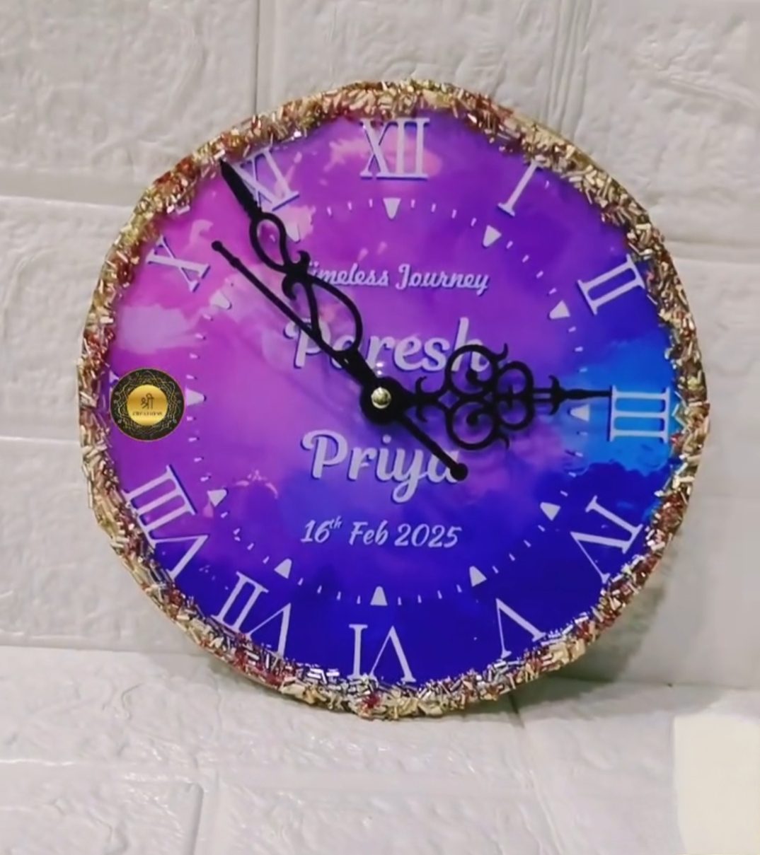 At Shree Creations, each clock is custom-designed using premium resin, enhanced with dried flowers, glitter, gold flakes, initials, names, or photos — creating a functional piece of art.